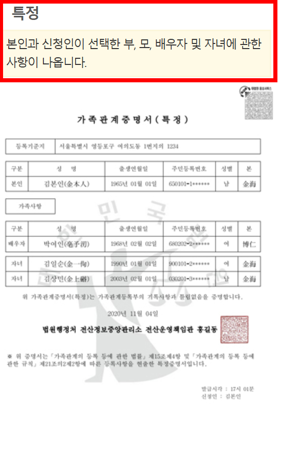 특정 증명서 => 결혼, 이사, 상속 등 특정한 목적에 맞춰 발급되는 증명서로 본인과 신청인이 선택한 부,모, 배우자, 자녀 등에 관한 정보가 포함됩니다.