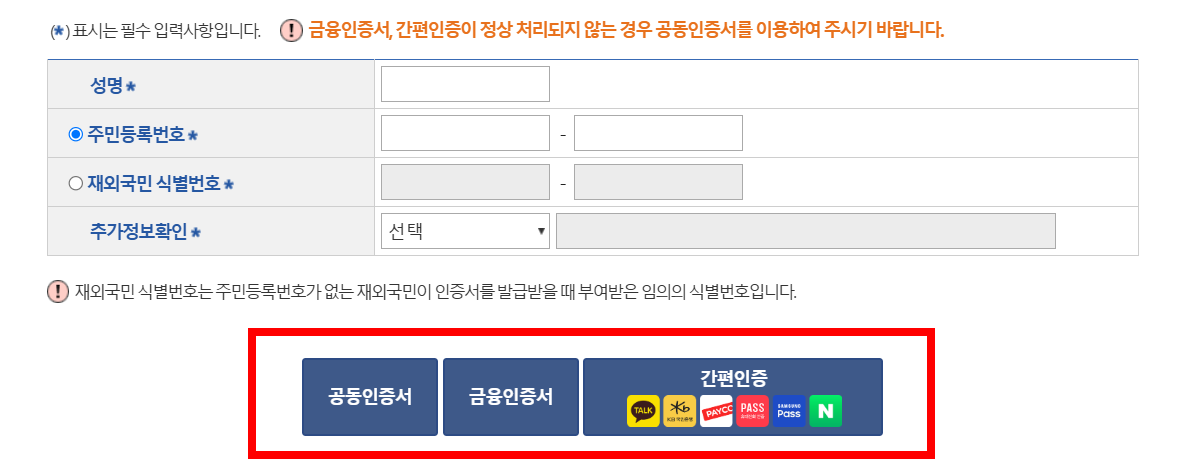 성명과 주민번호, 추가정보확인을 하시고 본인이 편한 방법으로 본인인증을 마치면 발급신청화면으로 이동됩니다.