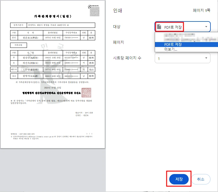 상단 프린터 버튼을 클릭하면 아래 화면처럼 인쇄옵션에서 프린터를 선택하시면 인쇄를, PDF로 저장을 선택하시면 파일로 저장하실 수 있습니다.