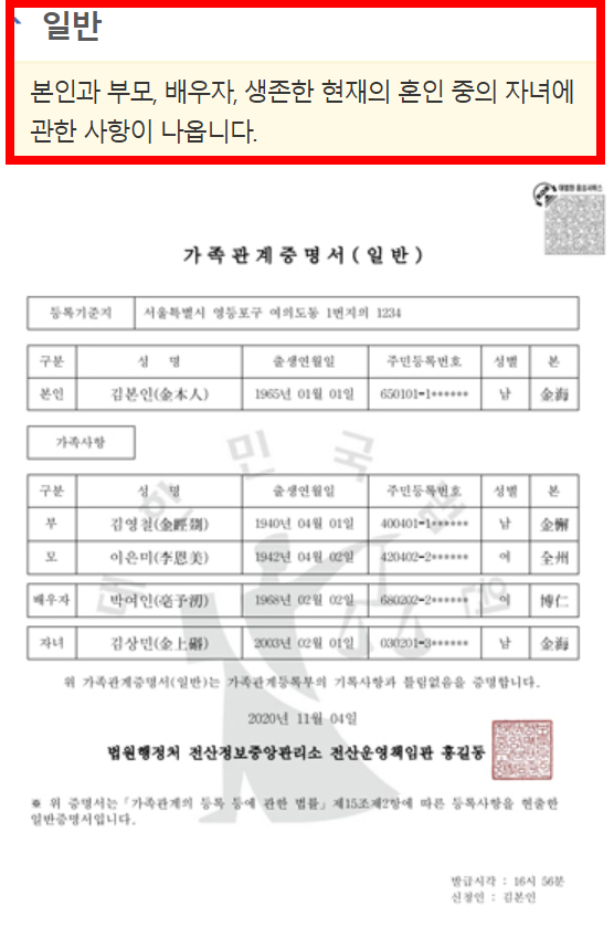 일반 증명서 => 본인의 출생, 혼인, 사망 등 기본적인 증명서로 본인과 부모, 배우자, 생존한 현재의 혼인 중의 자녀에 관한 정보가 포함됩니다.