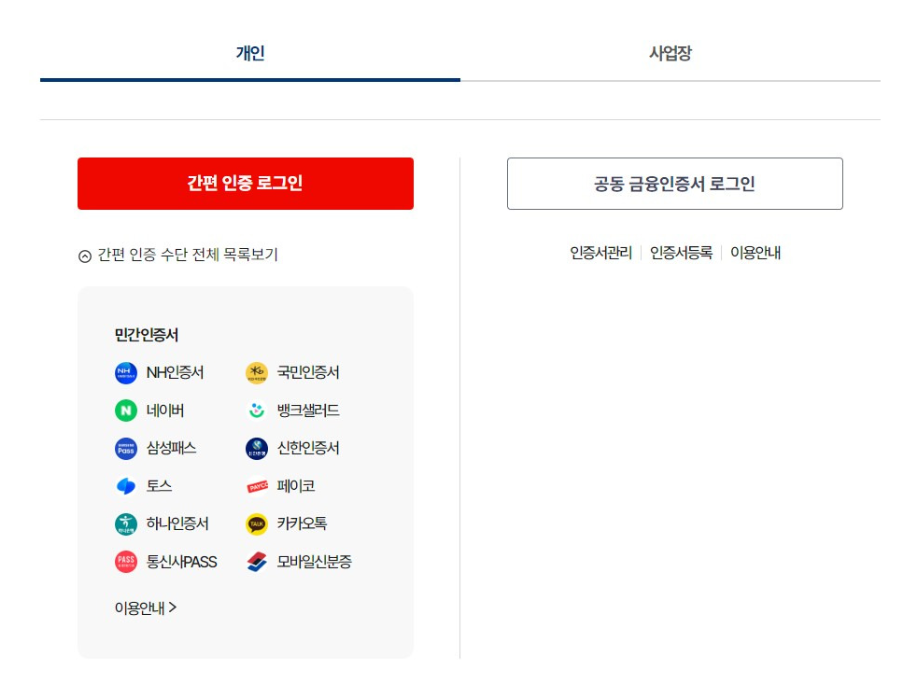 본인 인증을 위한 로그인이 필요해요. 공인인증서, 금융인증서, 카카오페이 인증, 네이버 인증 등 다양한 방법으로 로그인할 수 있습니다. 이 과정은 안전하게 보호됩니다.