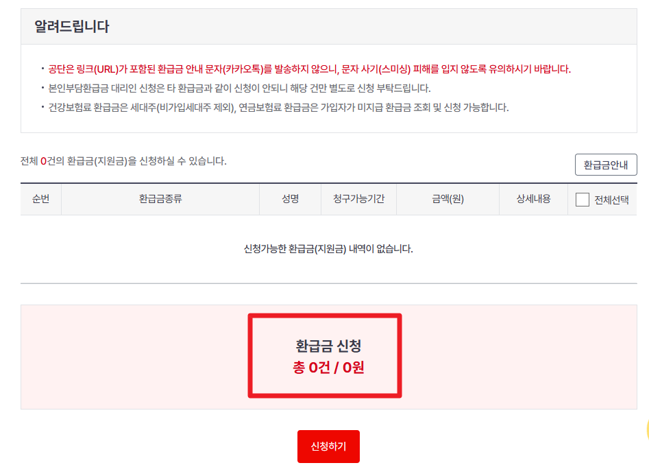 - 로그인 후 환급금 조회/신청 메뉴를 선택합니다.