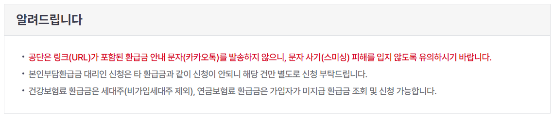 국민건강보험공단에서 보내는 문자는 링크를 포함하지 않습니다. 링크가 포함된 문자를 받았다면 스미싱 사기일 가능성이 있으니 주의하세요.