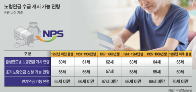 - 예를 들어, 지급 개시 연령이 65세라면, 60세부터 조기수령 가능.