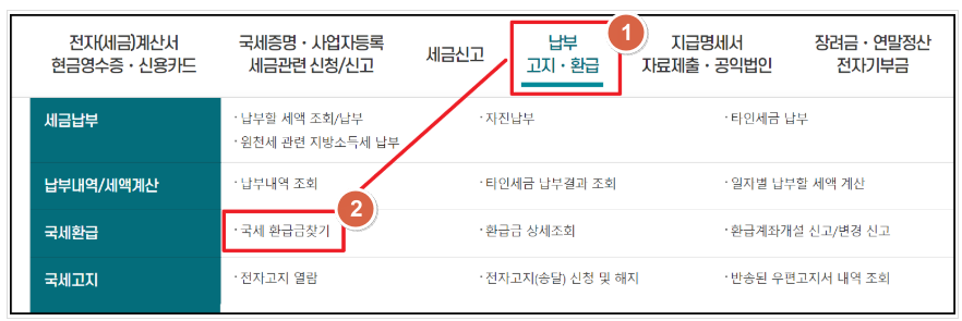 1. 국세청홈택스 사이트에 접속해서 상단 메뉴에서 납부·고지·환급을 선택 후 국세환급금 찾기를 클릭하세요.