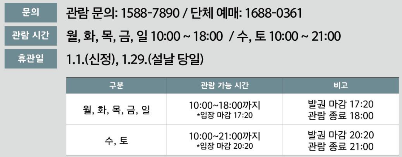 - 관람 시간: 매일 오전 10시부터 오후 6시까지 (수요일, 토요일은 오후 9시까지 연장)