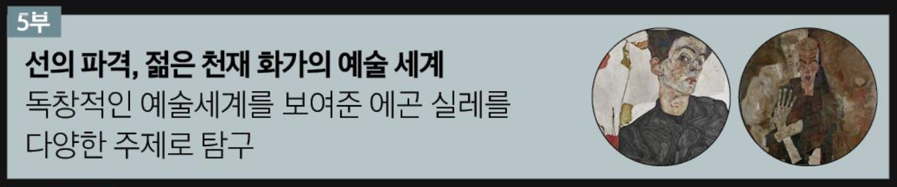 - 4부 ~ 5부: 에곤 실레로 대표되는 젊은 예술가들의 표현주의적 경향과 특징 조명