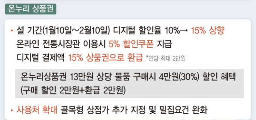 • 예시: 온누리상품권으로 13만 원 구매 시, 할인 2만 원 + 환급 2만 원 = 총 4만 원 절약!