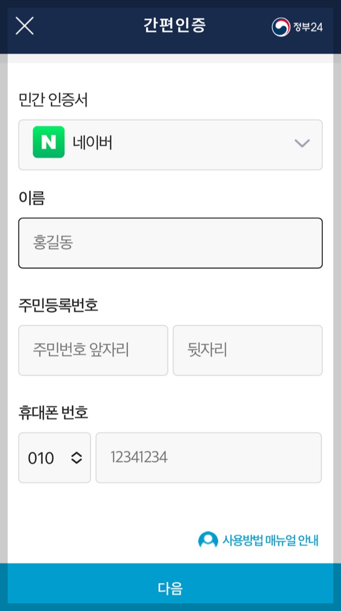 정부24앱을 들어가 보면 가장 첫 화면에 위와 같은 화면이 바로 나옵니다. 원활한 서비스를 위해 한시적으로 메인화면에 띄어주는 것 같아요!