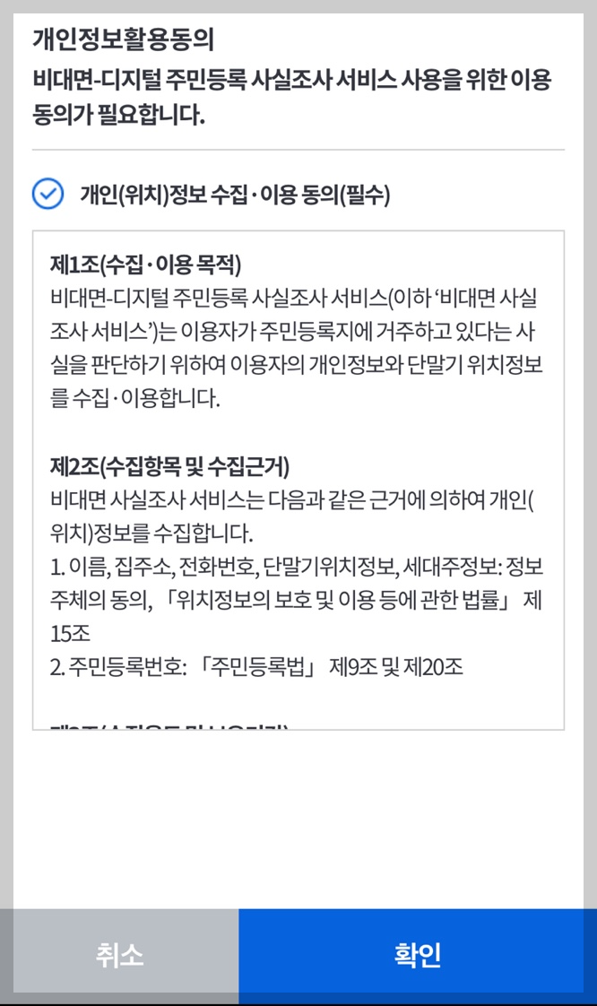 반드시 정부24 모바일앱을 통해서만 진행이 가능하고, 휴대폰 위치를 기반으로 하기 때문에 주민등록상 주소지에서 휴대폰 위치 기능을 켜놓아야 합니다. 회사나, 집이 아닌 다른 곳에서는 할 수 없답니다. 핸드폰 GPS 기능을 정상적으로 켜놓고 위치 활용 동의를 반드시 하셔야 하니 주의해주세요!