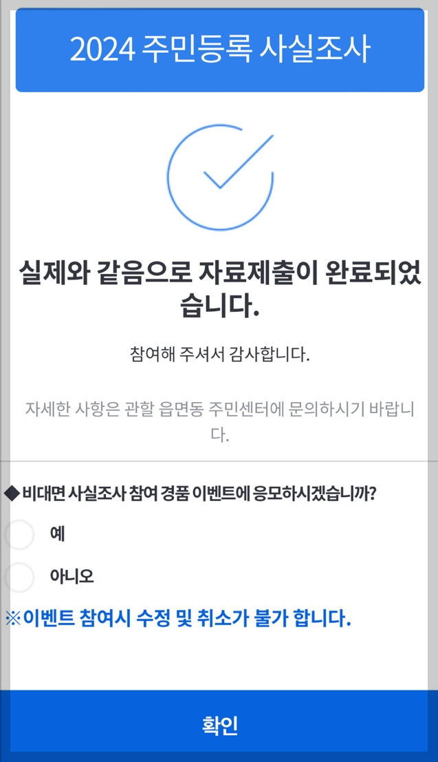 주소지 정보와 위치정보를 확인 후 자료제출을 누르면 2024 주민등록 사실조사가 완료됩니다. 이렇게 간단한 절차만으로도 주민등록 사실조사를 비대면으로 완료할 수 있답니다.