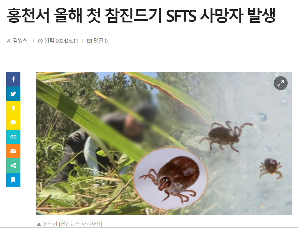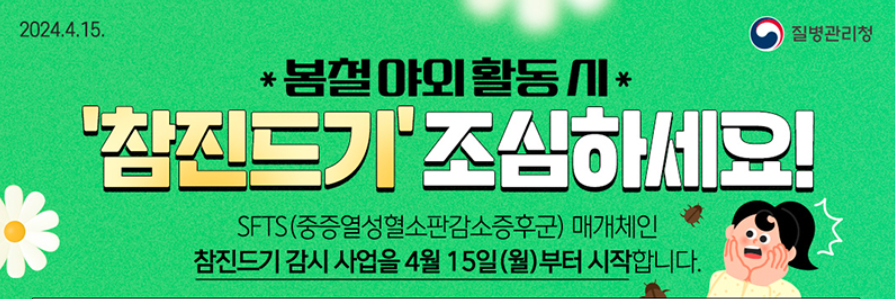 참진드기는 중증열성혈소판감소증후군(SFTS) 등을 전파하는 감염병 매개체입니다. SFTS에 걸리면 고열, 구토, 근육통,설사, 복통 등의 증상이 나타나고 혈소판 감소로 인한 출혈 증상이 나타날 수 있습니다. 감기몸살 증상과 유사.