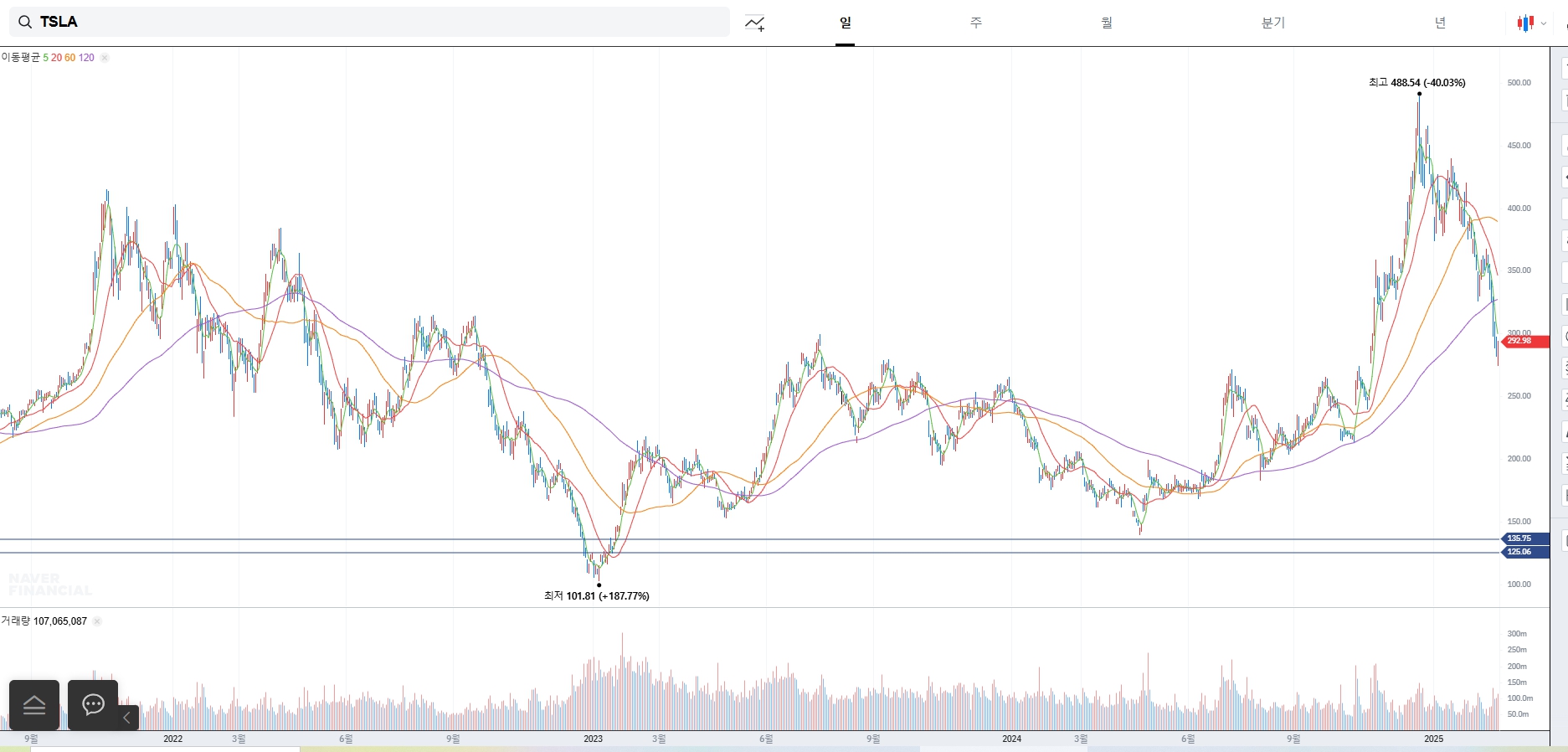 테슬라 주가 변동 차트 (최근 2년간 흐름)
