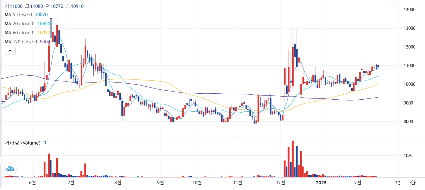 - 저항 및 지지선: 주요 저항선은 12,000원, 지지선은 9,500원 부근으로 형성되어 있으며, 이 범위 내에서 박스권 흐름을 보일 가능성이 큽니다.