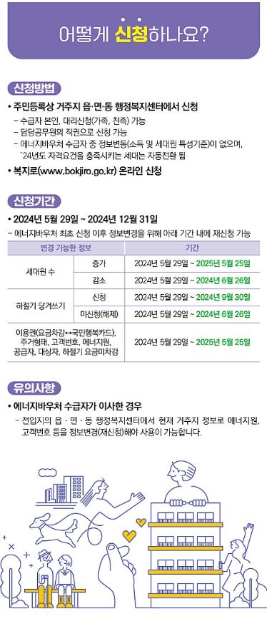 에너지 바우처 지원 대상자인 분들은 2024년 12월 31일까지 주민등록상 읍·면·동 행정복지센터에서 바우처 신청이 가능합니다. 거동이 불편하신 분들은 친족 등이 대리 신청을 할 수도 있고요. 읍·면·동 담당 공무원은 대상자 본인의 동의(구두 또는 서면) 하에 직권으로 신청이 가능합니다.