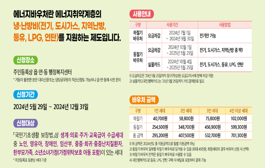 에너지 바우처는 저소득층이 전기, 가스, 연탄 등 에너지를 효율적으로 사용할 수 있도록 정부가 지원하는 이용권입니다. 지원금은 하절기(냉방)와 동절기(난방)로 구분되어 지급됩니다.