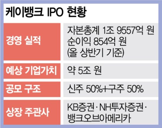 이는 올 기업 공개 시장 최대 규모라고 하는데, 현재 이미 비상장 시장에서 4조 5천억에서 5조 원 수준의 기업 가치로 주식이 거래되고 있다고 합니다. 케이뱅크가 상장 예비심사를 통과했으며 기업가치는 5~6조 기대감을 받고 있습니다.
